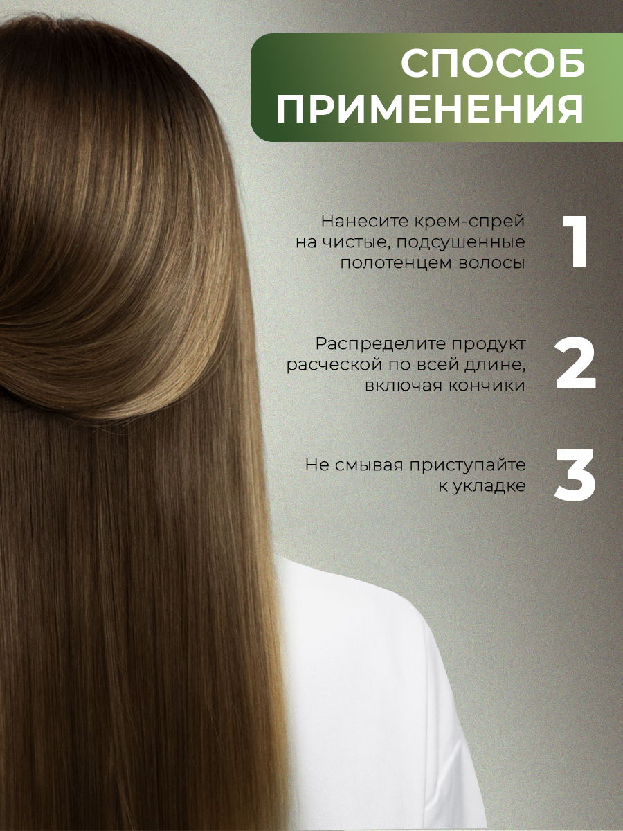 Использование этого продукта не требует особых усилий: достаточно распылить средство на влажные или сухие волосы и распределить равномерно по длине. Результат – легкость укладки, блестящие локоны и надежная защита от внешних факторов.