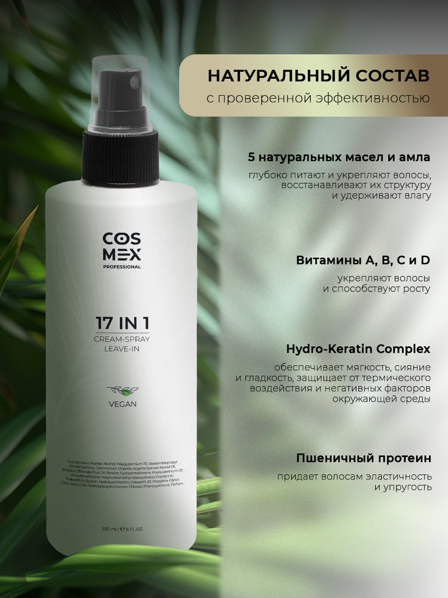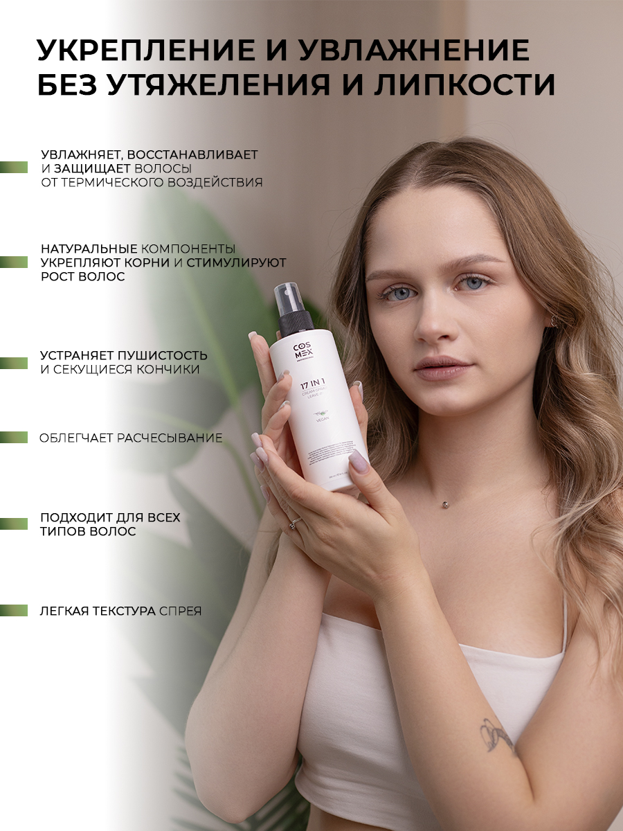 Крем-спрей несмываемый – это универсальное средство, созданное для комплексного ухода за волосами. Оно сочетает в себе 17 полезных функций, что делает его идеальным выбором для тех, кто стремится к здоровым и ухоженным локонам. Этот спрей обеспечивает термозащиту, защищая волосы от негативного воздействия горячих инструментов укладки.