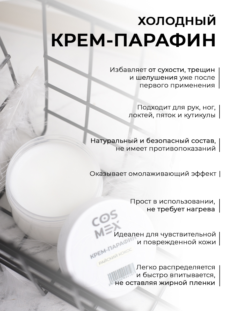 Увлажняющий парафин-крем для рук, ног, кутикулы и тела — это натуральное средство для ухода, созданное с использованием исключительно гипоаллергенных компонентов. Крем - парафин восстанавливает и заживляет сухую кожу, поддерживая ее здоровье, мягкость и красоту. В состав включены природные масла и витамин Е, которые глубоко увлажняют и питают кожу, предотвращая образование трещин и шелушения. Подходит для использования как на руках, так и на ногах, а также для ухода за телом и кутикулой.