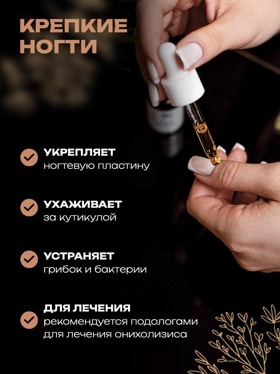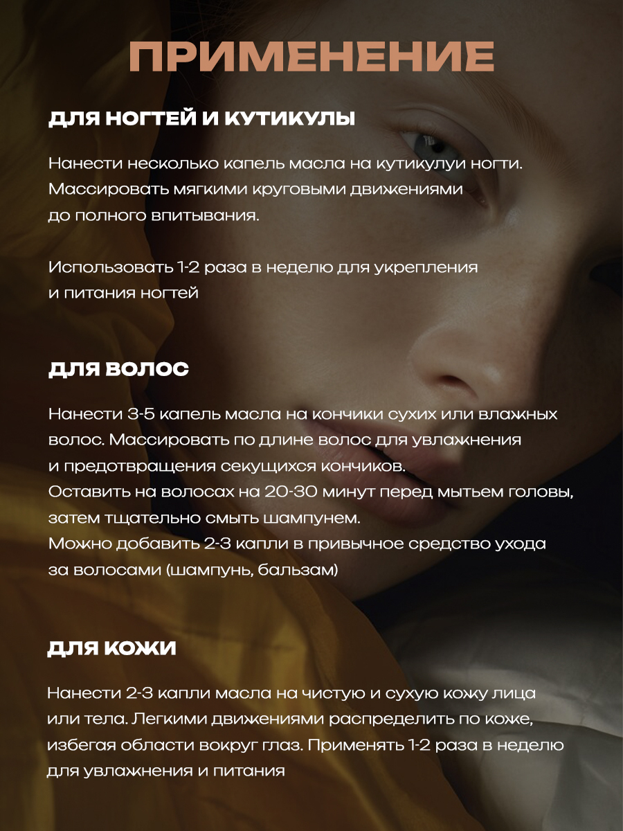 Применение: наносить тонкий слой масла на поражённые участки кожи или ногтей и лёгкими движениями втирать до полного впитывания 3 раза в день в течение 25-30 дней. При себорее втирать в кожу головы за 2-3 часа до мытья. Для лица и шеи можно добавить в крем.