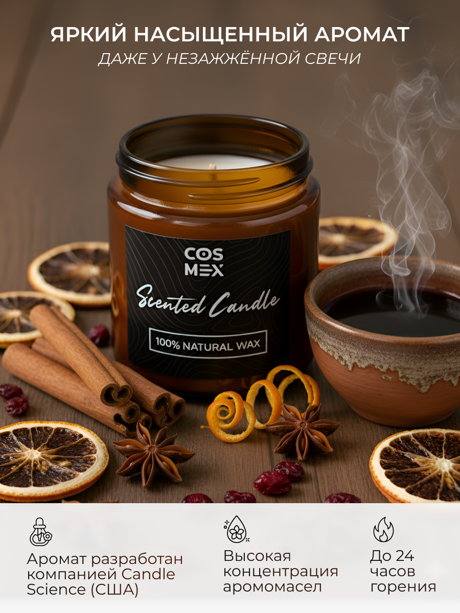 Окунитесь в уют зимних вечеров с новогодней ароматической свечой COSMEX «Глинтвейн», почувствуйте атмосферу горячего напитка, который дарит тепло, расслабление и праздничное настроение. Это аромат, созданный для тех, кто любит свечи с характером: пряные ноты корицы, бадьяна, цитрусовой цедры и тёплого красного вина раскрываются мягко и глубоко, наполняя пространство теплом и уютом.
