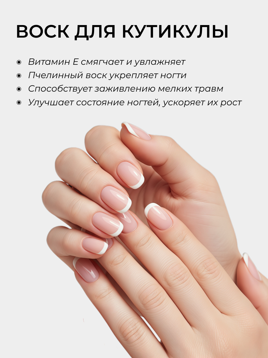 Основу составляют жёлтый и белый пчелиный воск, обладающие питательными и защитными свойствами. Карнаубский воск (натуральный растительный воск, получаемый из листьев бразильской восковой пальмы) придает текстуре легкость и быстрое впитывание. Масло ши и миндальное масло глубоко увлажняют и смягчают кожу, способствуя ее регенерации. Витамин E защищает ногти от повреждений и помогает удерживать влагу.