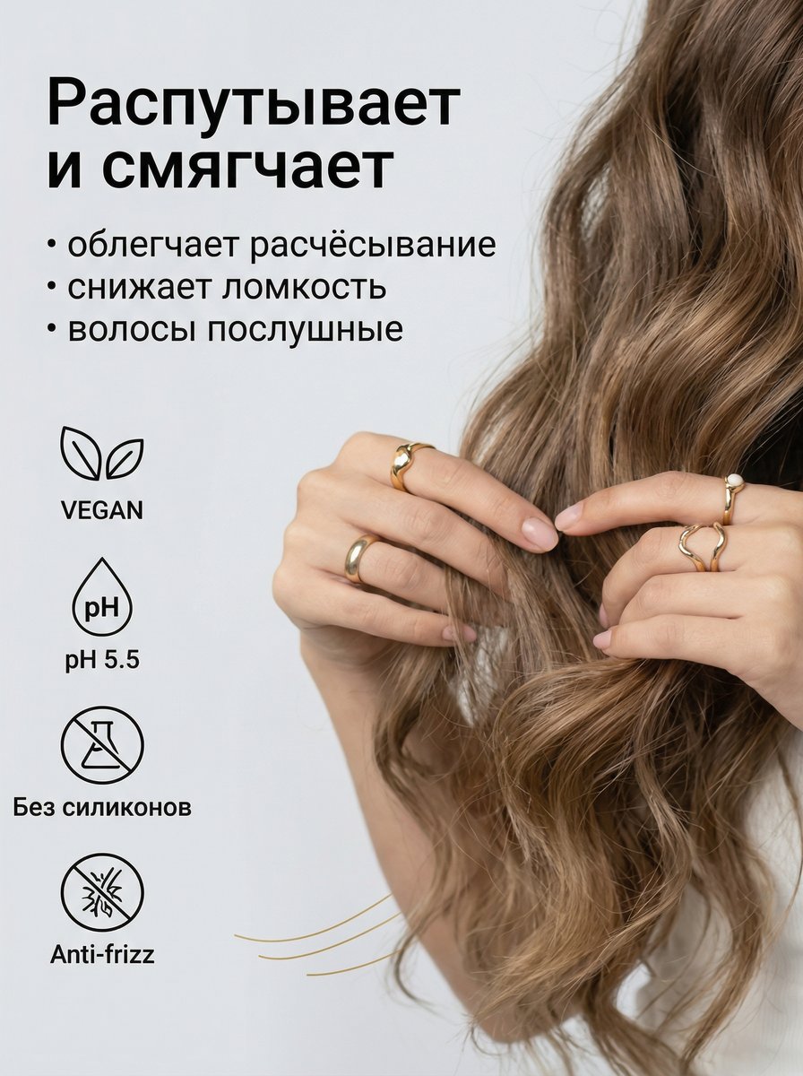 Бальзам для кудрявых и волнистых волос дополняет действие шампуня и обеспечивает уход по длине: распутывает, смягчает, помогает убрать ощущение жёсткости и сухости, снижает ломкость и делает волосы более гладкими. Благодаря кондиционирующему эффекту пряди легче разделяются, становятся аккуратными и ухоженными, а кудри и волны выглядят плотнее и более оформленными. Бальзам особенно полезен для пористых волос, которые часто пушатся, теряют форму и быстро становятся сухими на кончиках.