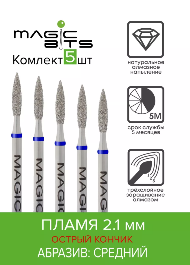 Набор Magic Bits фрез Алмазное пламя 2.1 мм ОСТРЫЙ кончик 5шт
