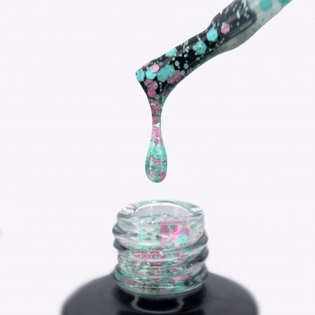 Топ матовый (10мл) средней вязкости, с бирюзовыми и розовыми шестигранниками разных размеров.